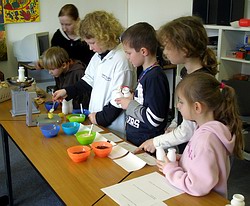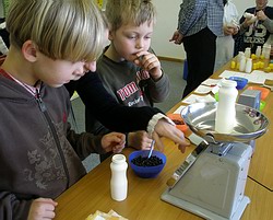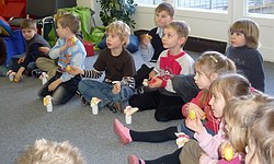 In den letzten Wochen haben alle fleißig Überraschungseier und kleine Plastikfläschchen gesammelt. Heute wurden nur endlich die Instrumente hergestellt. Pfeffer, Reis und Bohnen wurden gewogen und abgefüllt. Gar nicht so einfach! Spaß macht es doch und interessant ist es auch. Nun werden die selbstgebauten Instrumente den Musik-unterricht bereichern. |