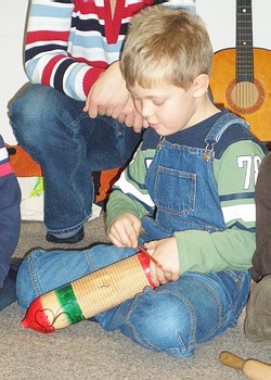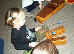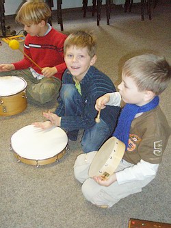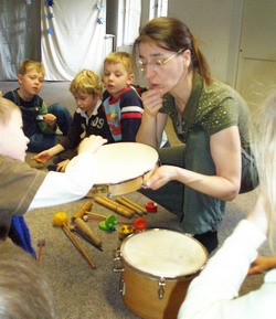 Die Kinder lernen sehr interessiert unterschiedlichste Schlaginstrumente kennen und spielen zusammen kleine Musikstücke.